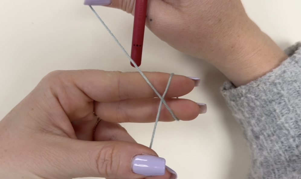 Pour cette méthode, tu commences par prendre le fil coupé de ta pelote, que tu mets à l’avant de tes doigts. Avec le fil de la pelote, tu vas tourner autour de ton index et de ton majeur, puis tu vas croiser tes fils, afin de former une sorte de « croix », comme sur la photo ci-dessous.