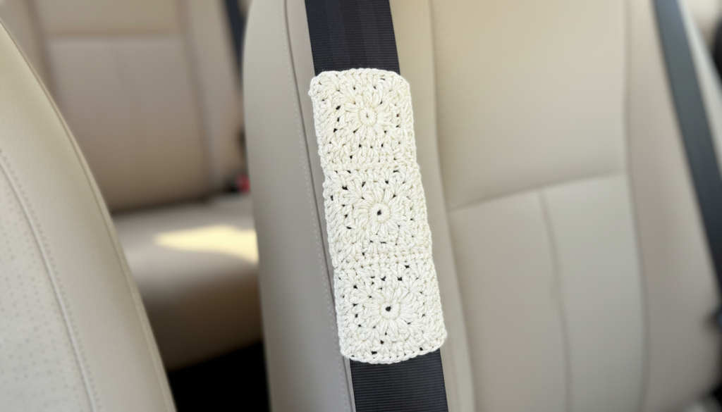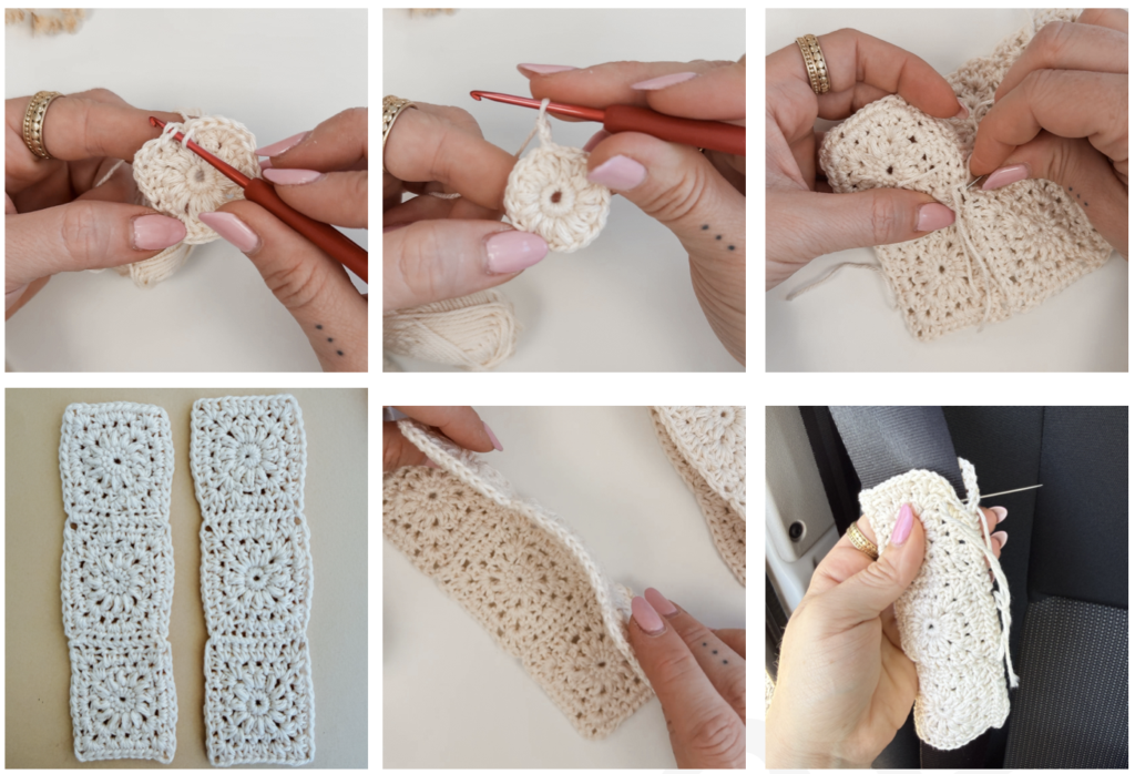 - Une fois vos 2 lignes de 3 carrés granny réalisées, positionnez-les autour de la ceinture de sécurité (une ligne dessus, une ligne dessous) et cousez les bord à bord de chaque côté.