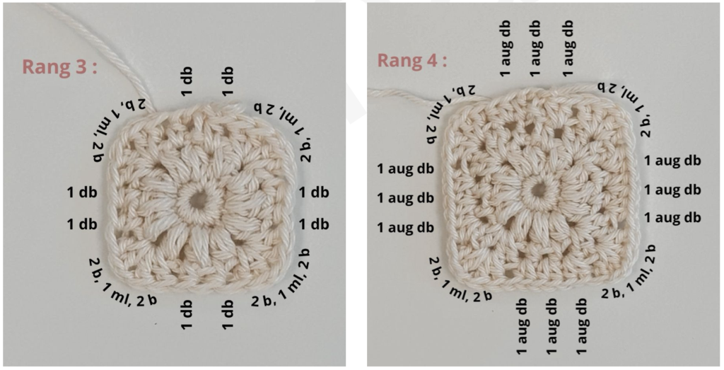 Rg 4 : 1 mc sous la mc du rg précédent, montez 2 ml (compte comme 1 db), 1 db dans la même m puis sous les arceaux suivantes faites 1 aug db, [2 b, 1ml, 2 b] = un angle au dessus de l’angle, (3 aug db, [2 b, 1ml, 2 b] = un angle au dessus de l’angle (x3), 1 aug db, 1 mc ds la 2ème ml de ce rg – 4