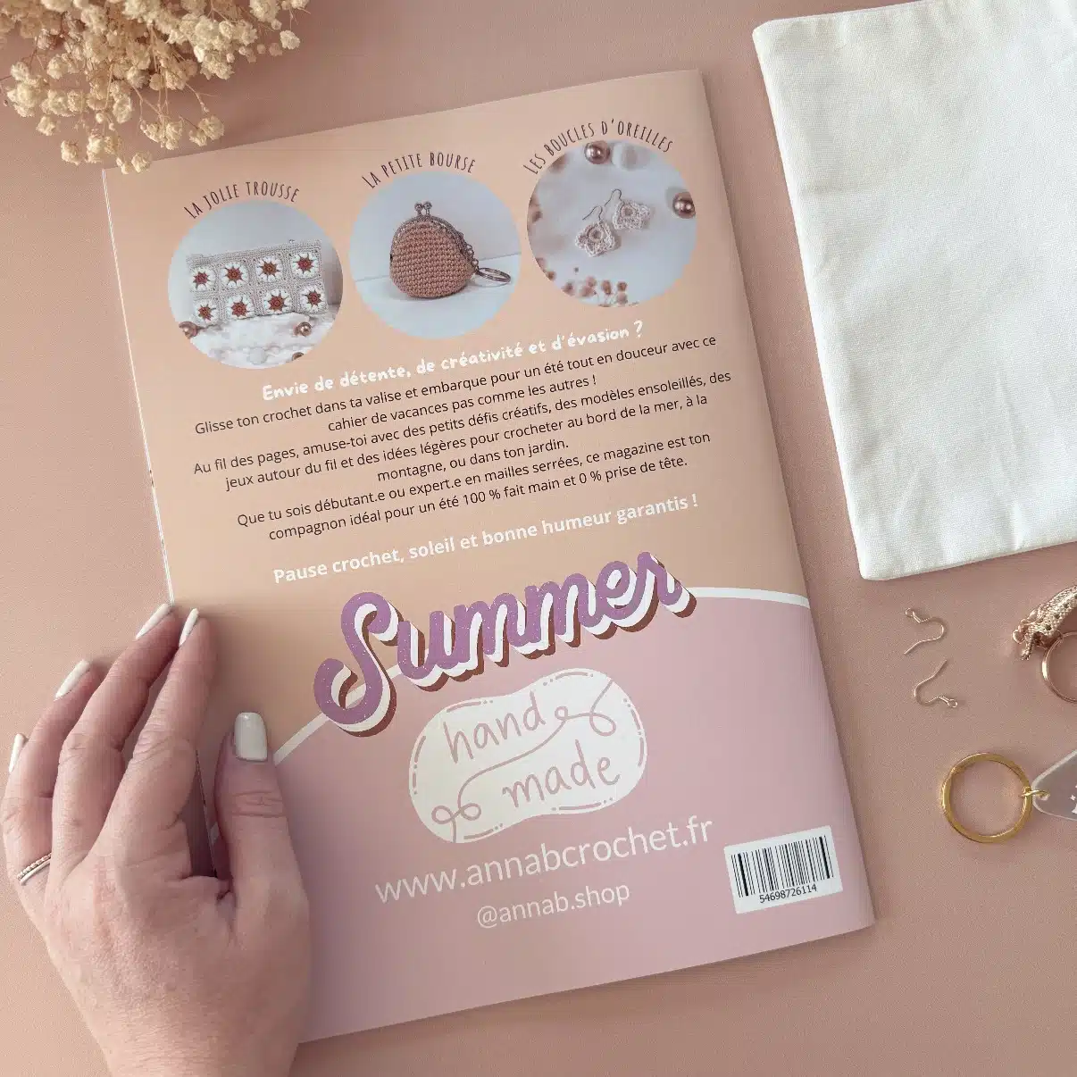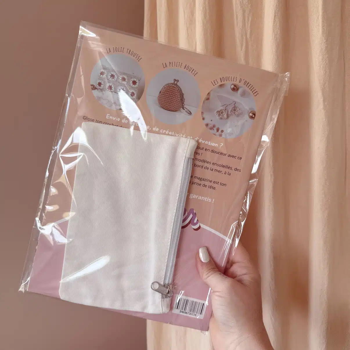 – 4 patrons (La trousse en granny, les boucle d’oreilles, la petite bourse vintage et la mini table basse) sous format papier (magasine + carte tuto).