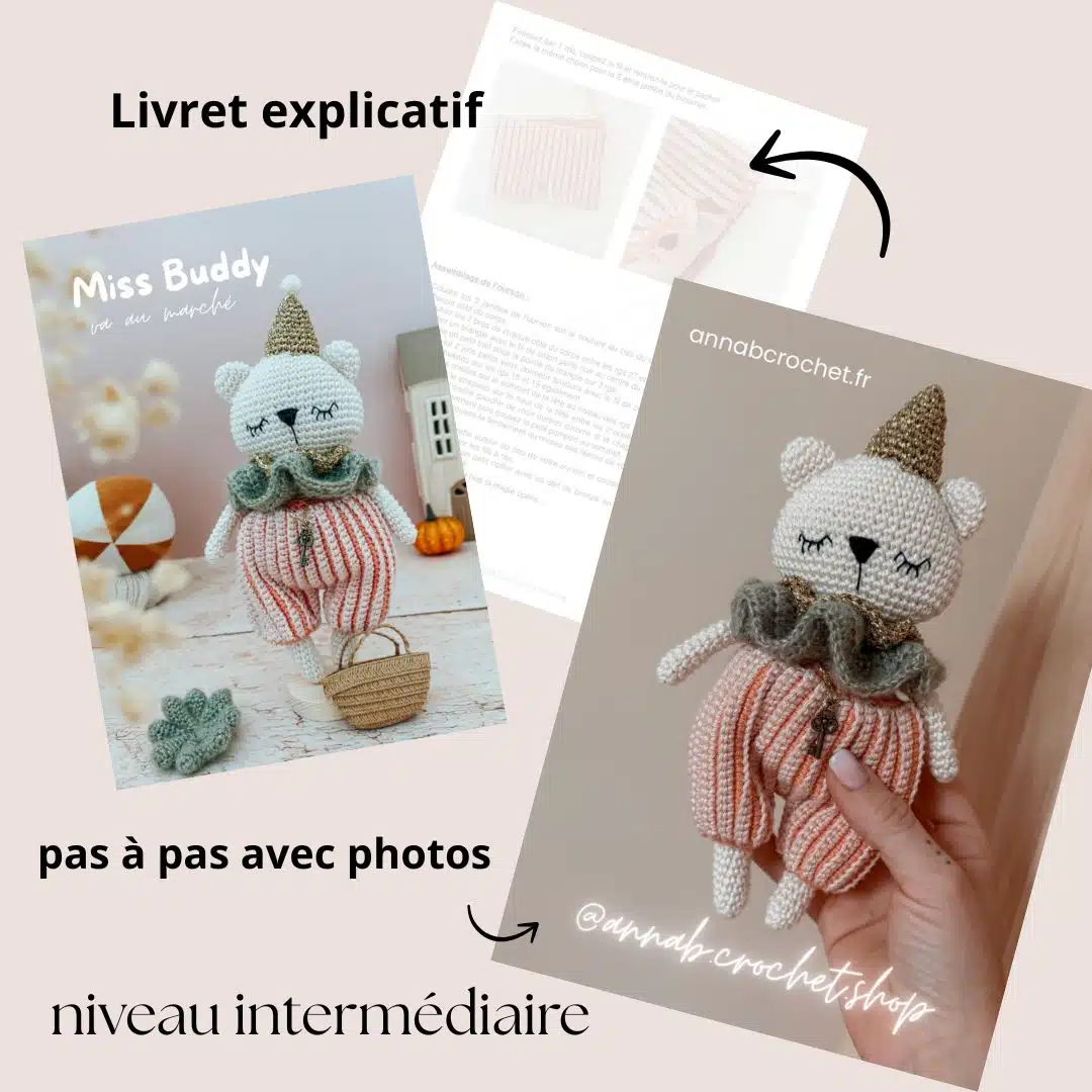 Laissez-vous charmer par Madame BUDDY, une adorable oursonne au cœur tendre et au style tout doux. Avec son pompon écru, sa touche dorée et ses nuances pêche et vert sauge, elle incarne parfaitement la délicatesse et la douceur qu’on aime tant retrouver dans nos créations au crochet.