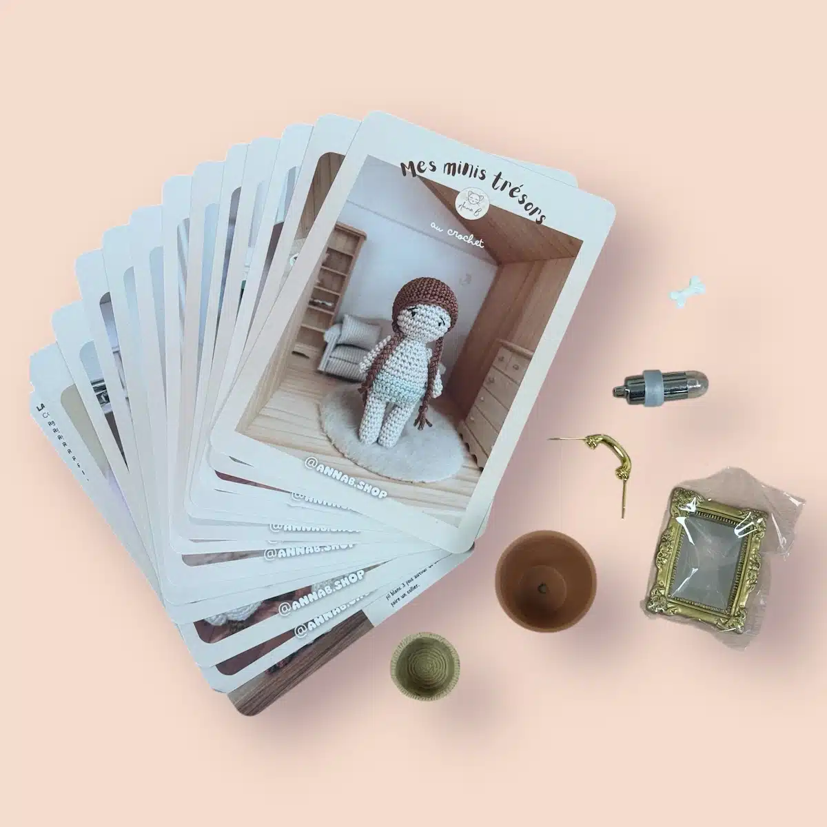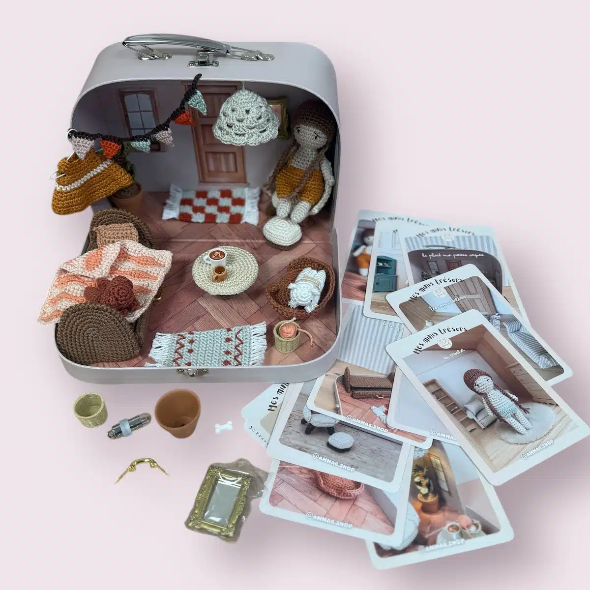Plongez dans un monde miniature rempli de douceur avec ce kit regroupant les 12 cartes patrons pour réaliser une adorable maison de poupée au crochet.
