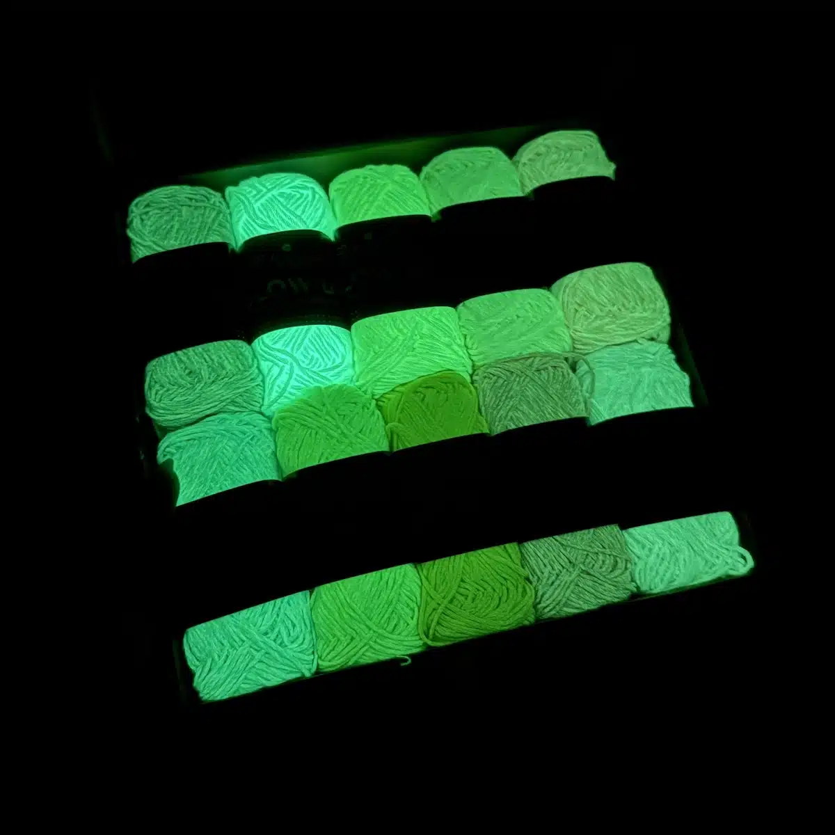 Ce fil innovant a la particularité de briller dans le noir. Grâce à un revêtement spécial, il absorbe la lumière pendant la journée (ou sous une lampe LED) et la restitue doucement dans l’obscurité, créant une lueur magique et douce qui met en valeur vos ouvrages.
